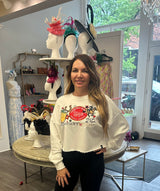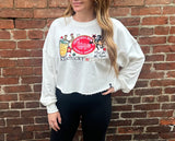 This Derby Sweatshirt is made with a blend of 60% cotton and 40% polyester fabric, featuring a white color and long sleeves. The front is detailed with patchwork and the cropped cut gives it a stretchy fit.
